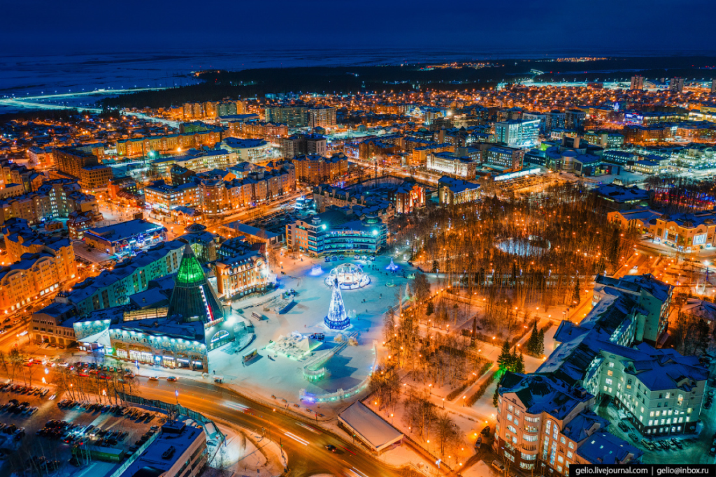 Лучше всего по ночам в Ханты-Мансийске гулять. Просто гулять, любуясь на подсвеченные здания нестандартной архитектуры, залитые огнями уличных фонарей улицы и площади.